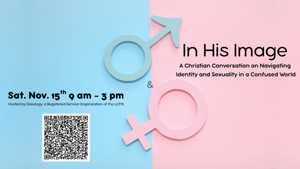 We have the privilege of hosting Doxology, a Registered Service Organization of the LCMS, on Saturday, November 15th, for a one-day public Conference called In His Image: A Christian Conversation on Navigating Identity and Sexuality in a Confused World. Please use the link below for more information and to register. Registration is required.